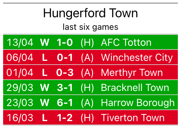 Hungerford beat AFC Totton 1-0 last time out, also on April 13.