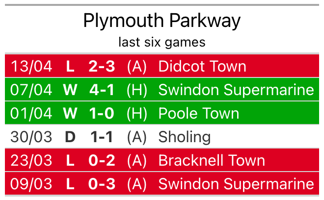 Plymouth Parkway, meanwhile, lost their last match, 3-2 against Didcot Town.