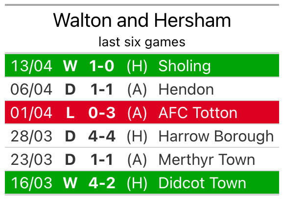 With two wins and three draws over that period, Walton & Hersham’s form is slightly better – they have taken nine points from 18, compared to the home team’s seven.
