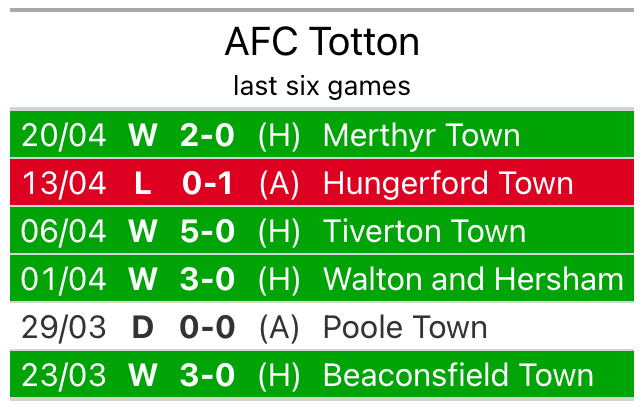 And also with four wins and a draw over that period, Totton’s form is identical – they have both taken 13 points from 18.
