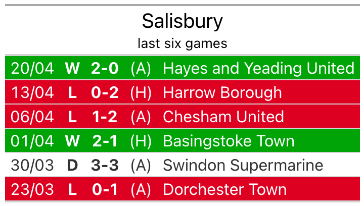 Salisbury also won their last match, 2-0 against Hayes and Yeading United.