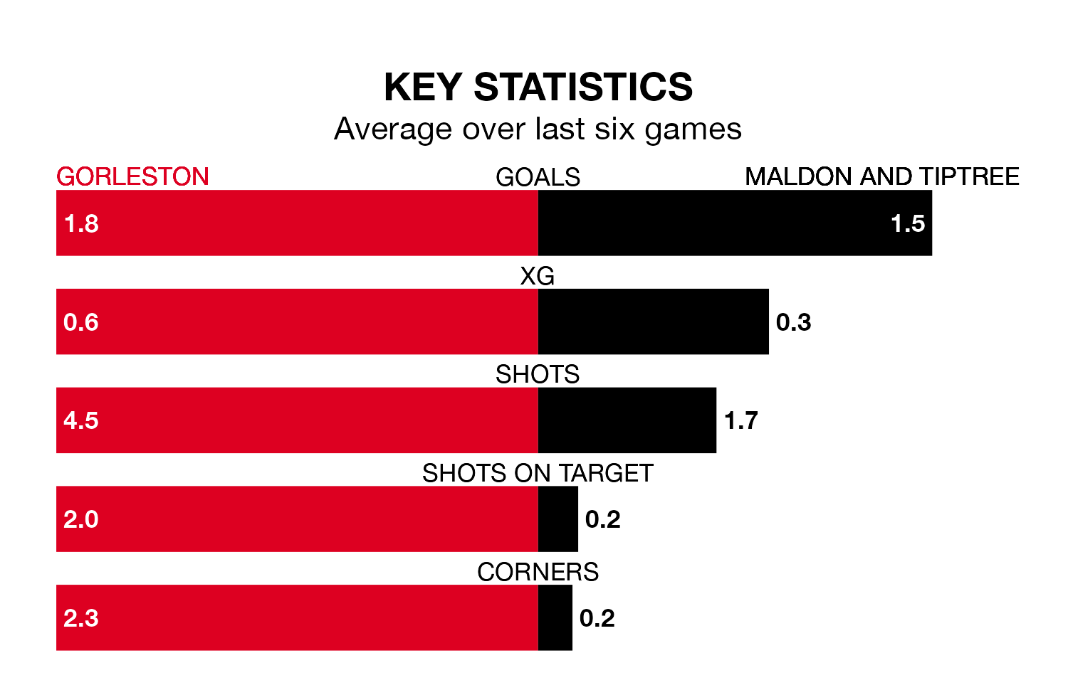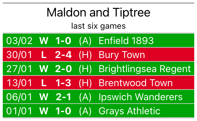 With four wins and two losses over that period, Maldon & Tiptree’s form is slightly better – they have taken 12 points from 18, compared to the home side’s 11.