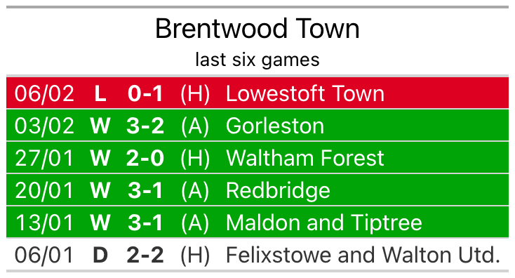 Brentwood, who sit fourth in the league after 24 games, fell to a 1-0 home defeat to Lowestoft Town on February 6.