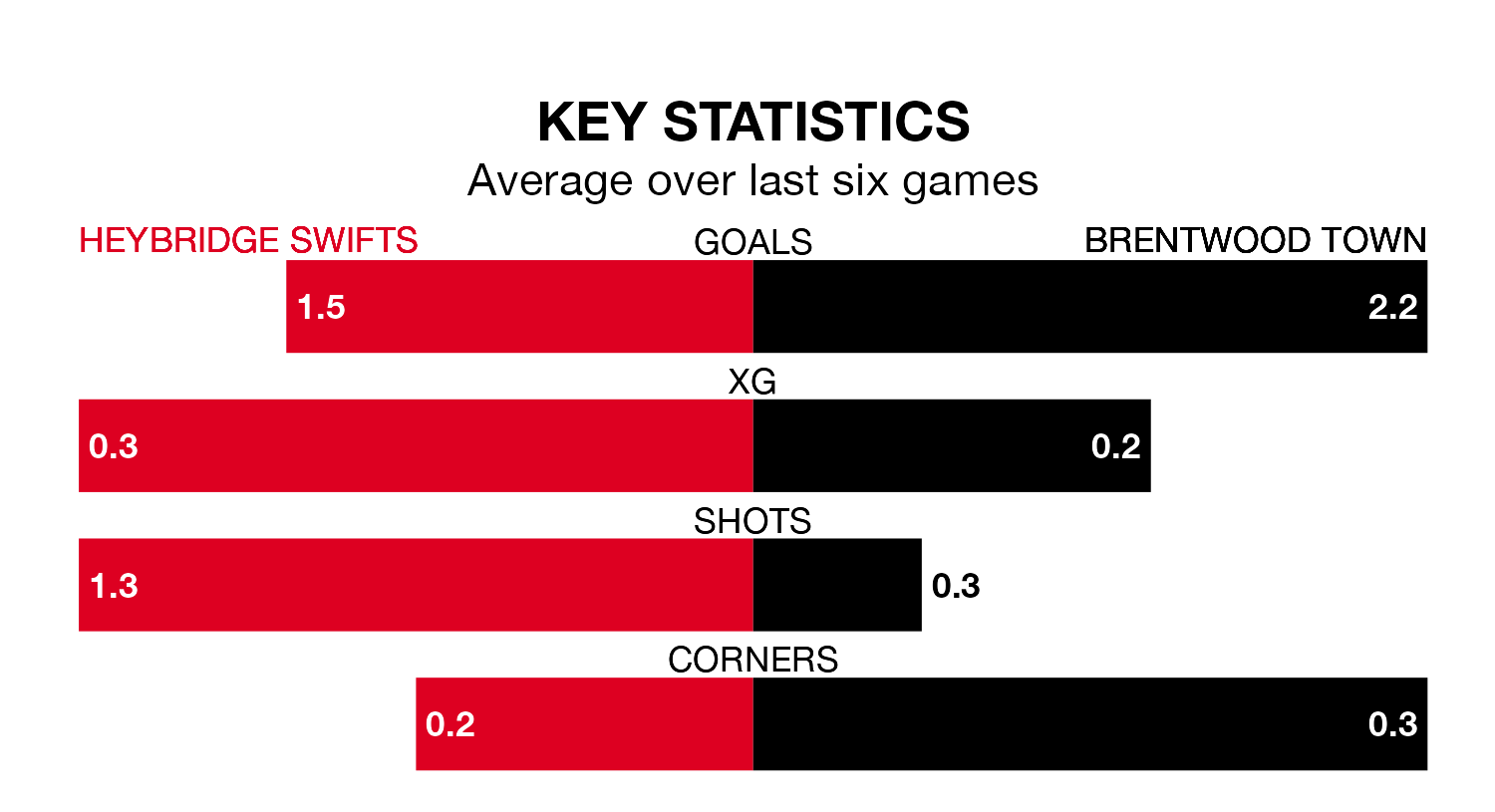 On average, Heybridge Swifts scored 1.0 goal and Brentwood 1.2 in those matches.