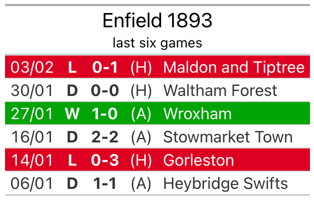 In their last league match, on February 3, Enfield 1893 lost to Maldon and Tiptree 1-0 at home.