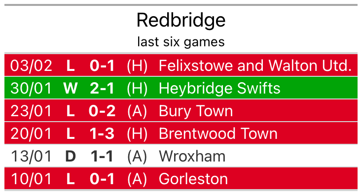 Redbridge’s last match was on February 3, a 1-0 loss against Felixstowe and Walton Utd..