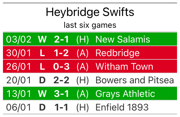 In their last league match, on February 3, Heybridge Swifts beat New Salamis 2-1 at home.