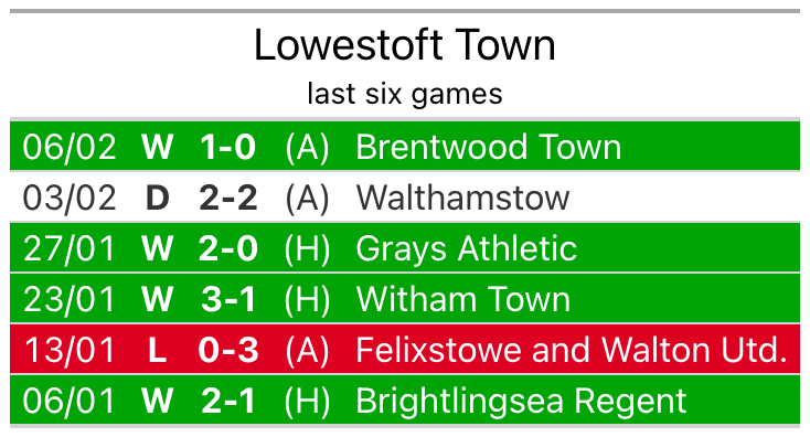 Lowestoft also won, 1-0 away at Brentwood Town on February 6.