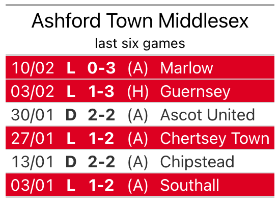 Ashford Town Middlesex’s last match was on February 10, a 3-0 loss against Marlow.