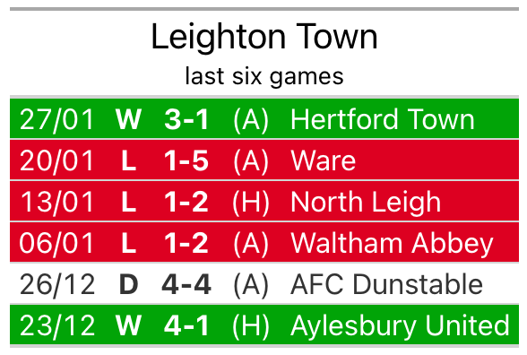 In their last league match, on January 27, Leighton beat Hertford Town 3-1 away.