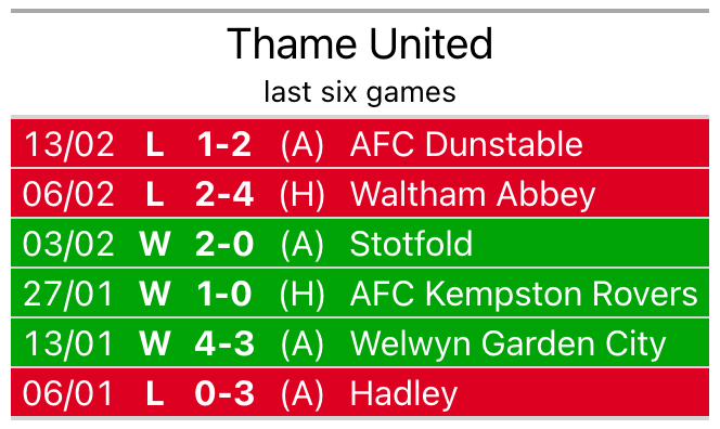 With three wins and three losses over that period, Thame’s form is slightly better – they have taken nine points from 18, compared to Leighton’s seven.