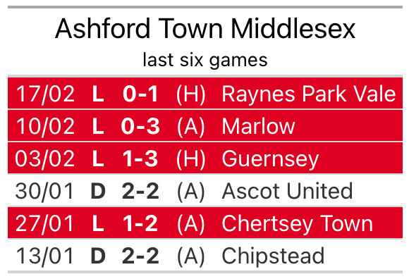 Ashford Town Middlesex are 19th in the table after 26 games, of which they have won five and drawn six, earning 21 points.
