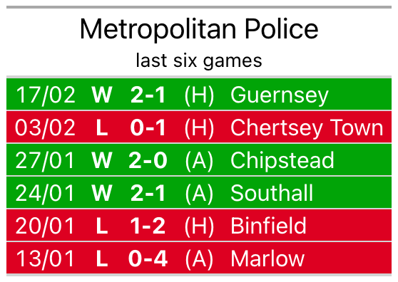 Metropolitan Police beat Guernsey 2-1 last time out, also on Saturday.