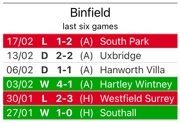 In their last league match, on Saturday, Binfield lost to South Park 2-1 away.