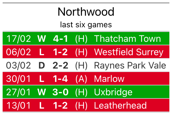 Their last meeting was on September 5, when Northwood won 1-0 at home.
