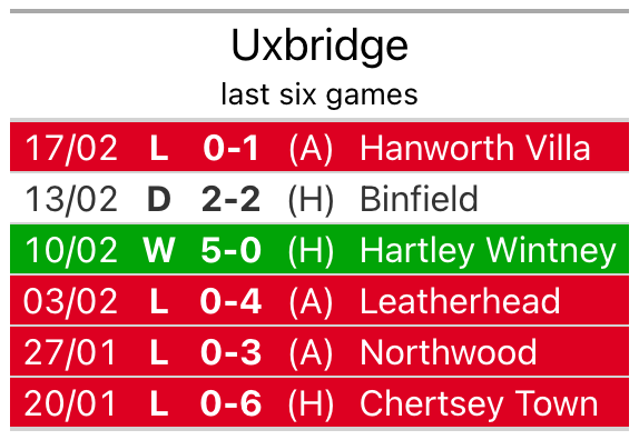 They travel to play an Uxbridge side 12th in the standings, who lost in their last match, 1-0 against Hanworth Villa, on February 17.