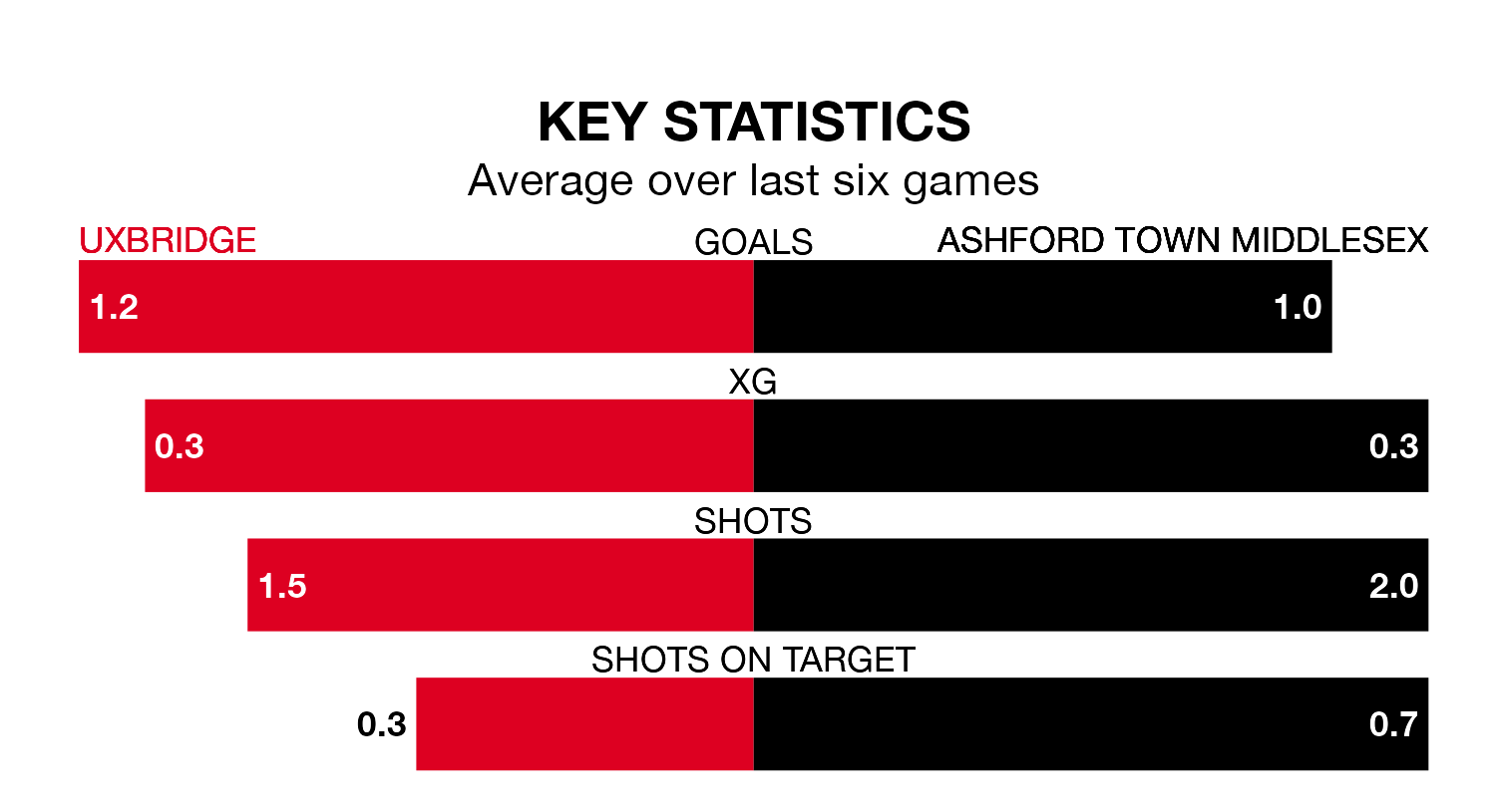 In the last 10 years, Uxbridge and Ashford Town Middlesex have played each other on seven occasions. Uxbridge won four of them, Ashford Town Middlesex two, and they drew once.
