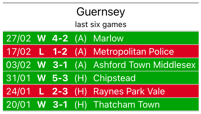 Guernsey are in reasonable form in the Isthmian League Division One South Central, with four wins and two losses from their last six games.