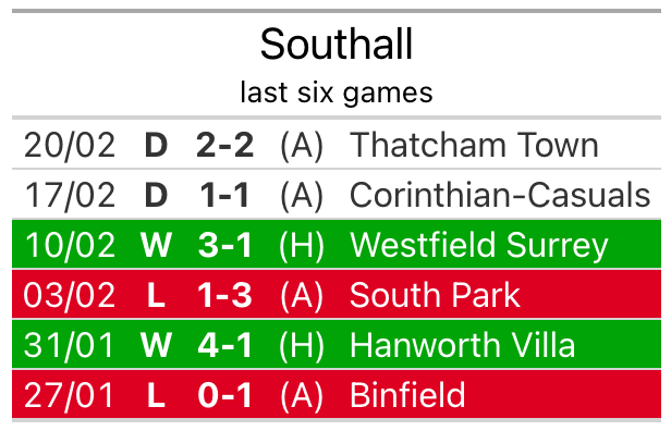 Southall drew, 2-2 away at Thatcham Town on February 20.