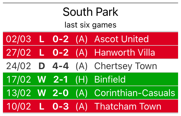 South Park are 12 places ahead of the home side in ninth, with 12 wins and seven draws putting them on 43 points.