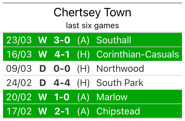 Chertsey’s last match was on March 23, a 3-0 win against Southall.