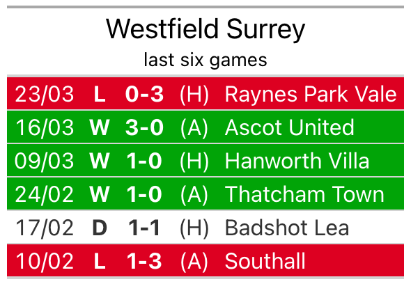 Westfield Surrey lost 3-0 against Raynes Park Vale last time out, also on March 23.