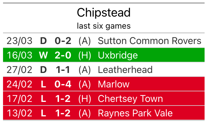 Chipstead are also below average scorers, with 1.2 goals per game, compared to a league average of 1.6. They have conceded 2.1 goals per game.