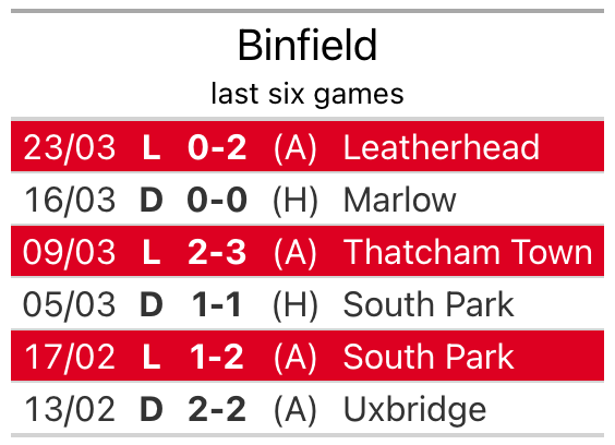 Binfield lost 2-0 against Leatherhead last time out, also on March 23.