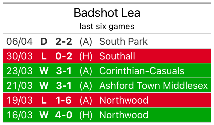 In their last league match, on Saturday, Badshot Lea drew with South Park 2-2 away.
