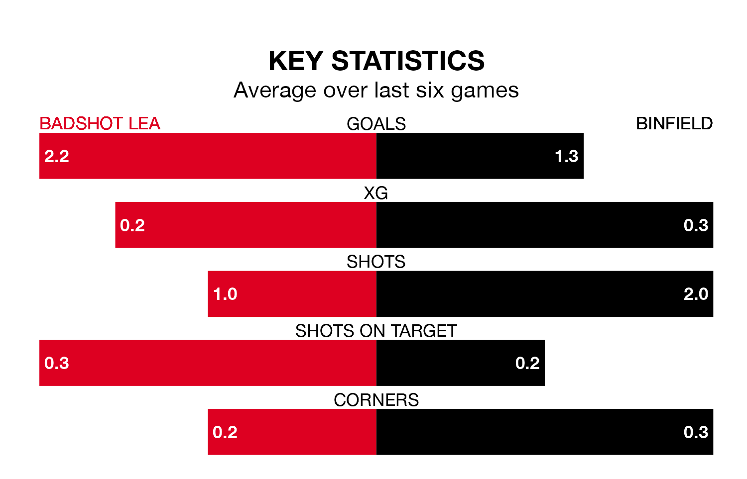 Badshot Lea, meanwhile, are above average scorers, with 1.7 goals per game, compared to a league average of 1.6. They have conceded 1.6 goals per game.