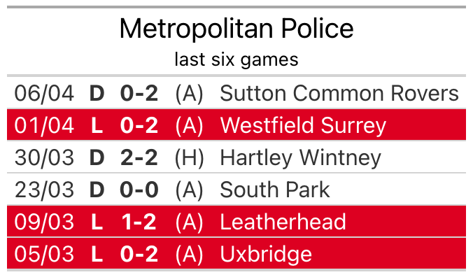 Metropolitan Police have lost four and drawn three matches since they last earned three points – against Guernsey on February 17.