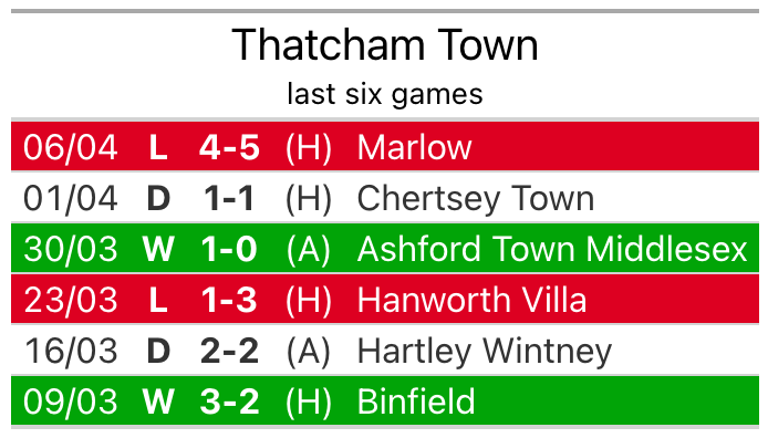 Thatcham lost 5-4 against Marlow last time out, also on April 6.