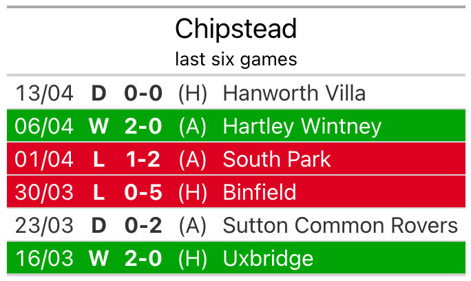 Chipstead, meanwhile, drew their last match, 0-0 against Hanworth Villa.
