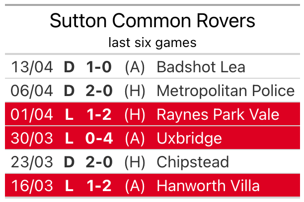 Sutton Common’s last match was on April 13, a 1-0 draw against Badshot Lea.