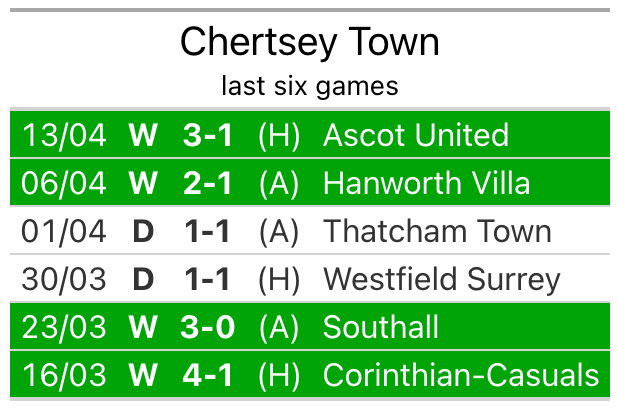 Chertsey beat Ascot United 3-1 last time out, also on April 13.