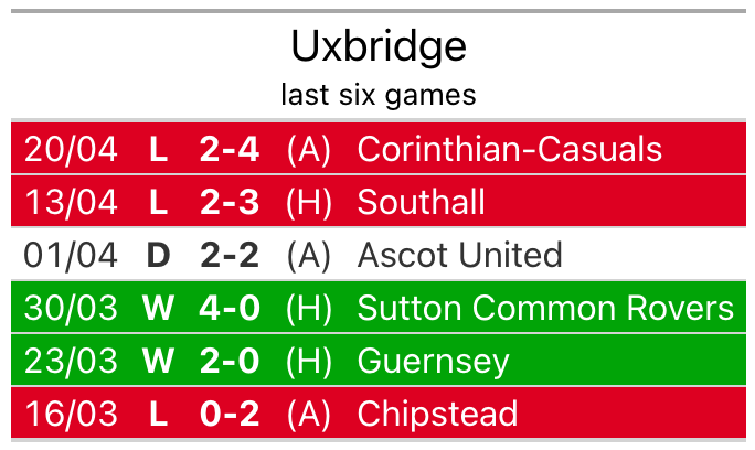 Uxbridge are nine places ahead of the home side in 11th, with 15 wins and five draws putting them on 50 points.