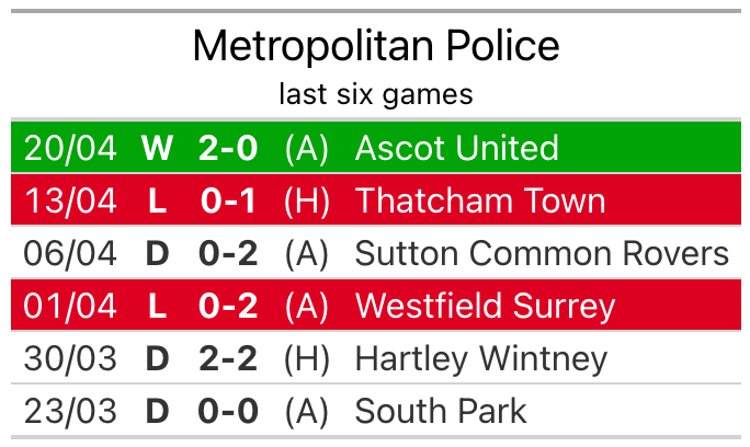 In their last league match, on April 20, Metropolitan Police beat Ascot United 2-0 away.