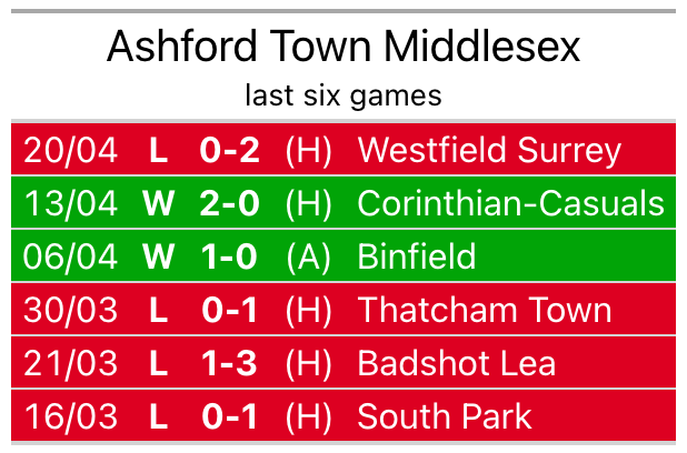 Ashford Town Middlesex are also below average scorers, with 1.1 goals per game, compared to a league average of 1.6. They have conceded 1.7 goals per game.