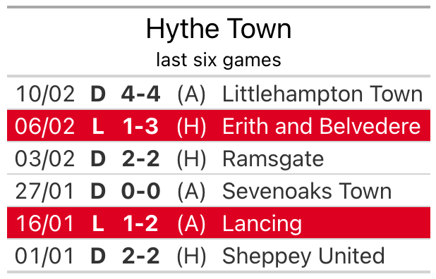 Hythe drew 4-4 with Littlehampton Town last time out, on February 10.