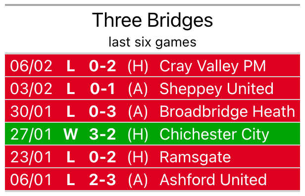 Three Bridges lost 2-0 against Cray Valley PM last time out, on February 6.