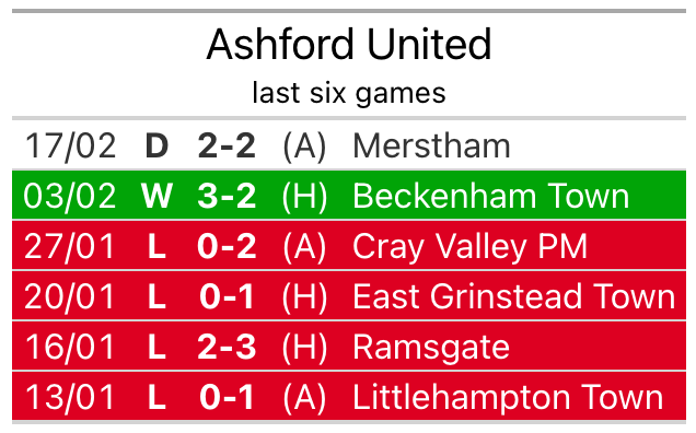 Ashford’s last match was on February 17, a 2-2 draw against Merstham.