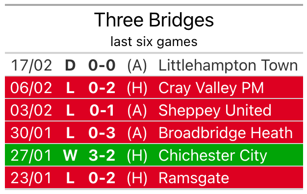 Three Bridges’s last match was on February 17, a 0-0 draw against Littlehampton Town.