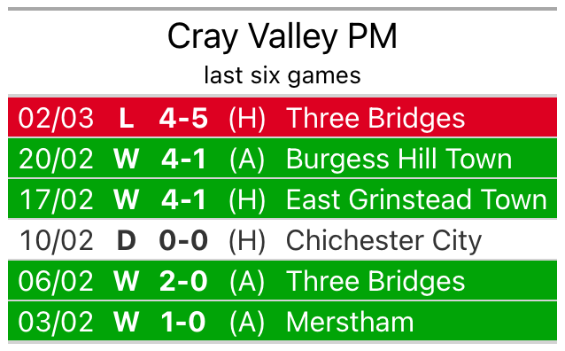 Cray Valley PM, who sit second in the league after 27 games, fell to a 5-4 home defeat to Three Bridges on Saturday.