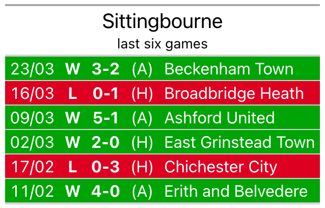 Sittingbourne are in reasonable form in the Isthmian League Division One South East, with four wins and two losses from their last six games.