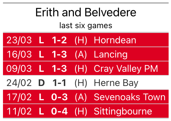 Erith & Belvedere are 19th in the table after 31 games, of which they have won five and drawn five, earning 20 points.