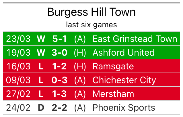 Burgess Hill beat East Grinstead Town 5-1 last time out, also on March 23.
