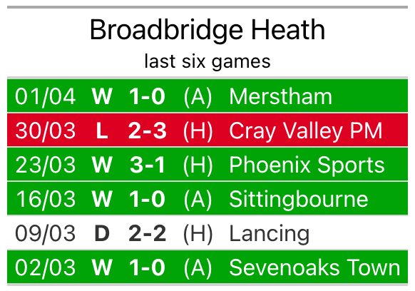 In their last league match, on Monday, Broadbridge Heath beat Merstham 1-0 away.