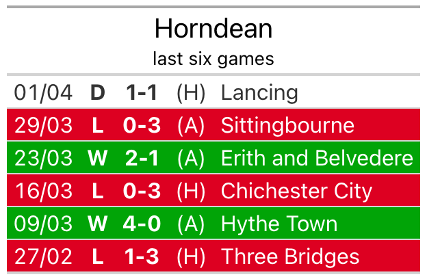 Horndean are also below average scorers, with 1.6 goals per game, compared to a league average of 1.7. They have conceded 1.8 goals per game.