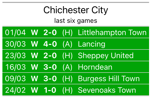 It means Chichester have picked up the maximum 21 points from their last seven games, and they face an Erith & Belvedere side who have lost their last two matches, and collected three points from the last possible 21.