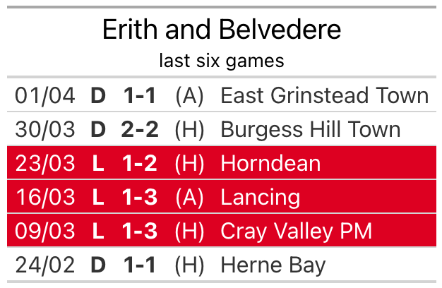 Erith & Belvedere are 19th in the table after 33 games, of which they have won five and drawn seven, earning 22 points.
